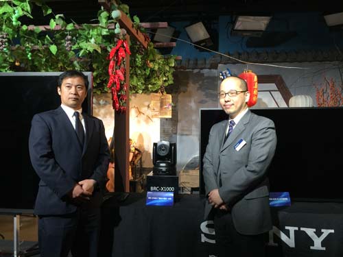 新产品揭幕, 左为日本总部索尼专业系统集团摄像机系统企划市场部产品规划师-岩崎佑树, 右为索尼中国专业系统集团云台摄像机与视频会议系统销售总监-杨天元