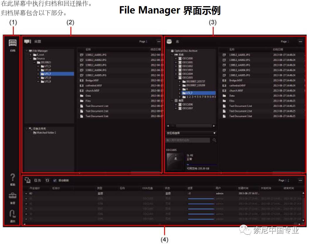 File Manager软件界面 总结: 通过 ODA 光盘库,实现与硬盘阵列类似的工作流程,但是素材安全性大大提高,并能实现快速调用。避免了媒资繁复的审批、编目等流程,不用改变现有的工作流程和习惯,为客户素材保存提供了一个更实际、更安全的解决方案。